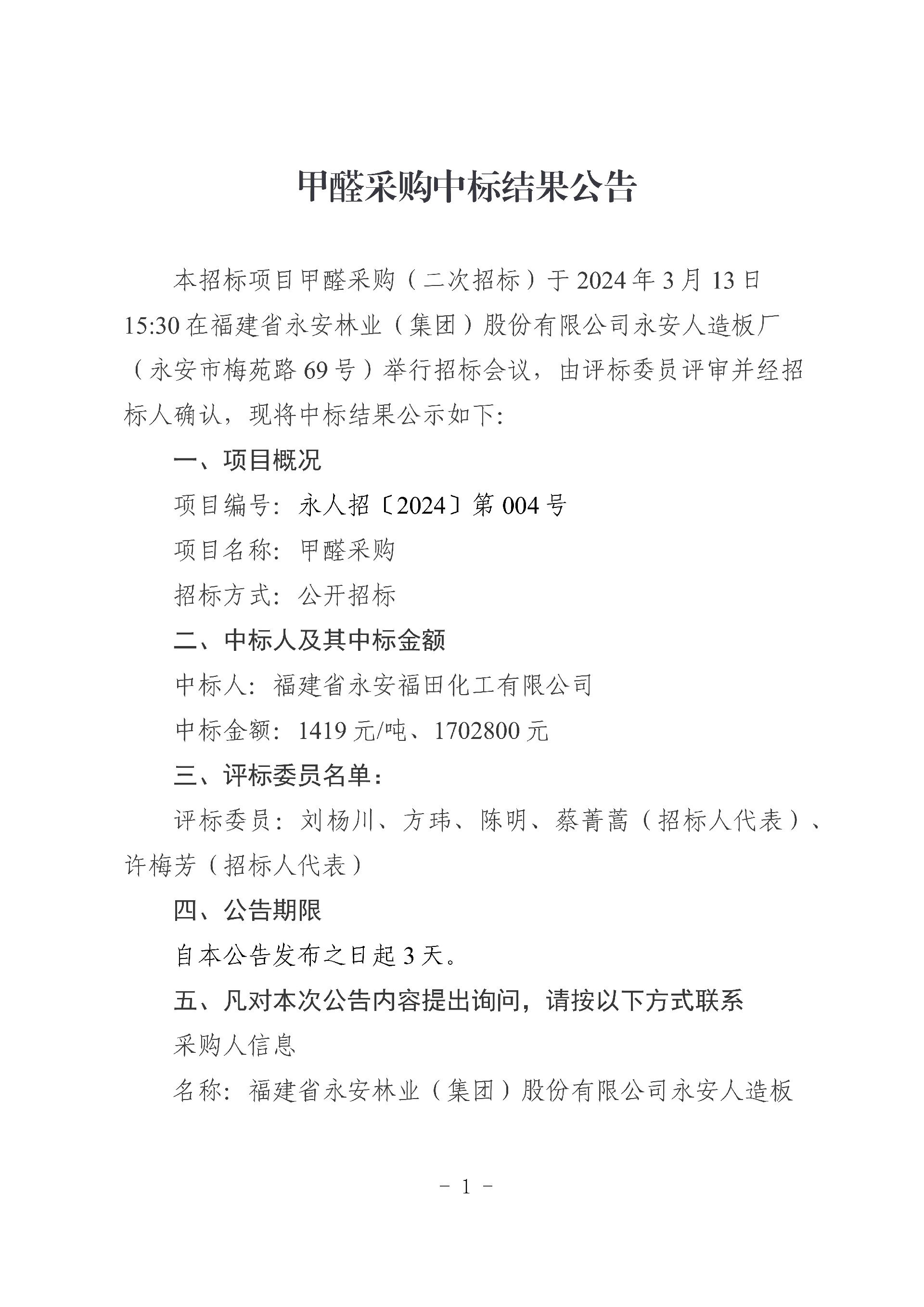永安人造板廠工業(yè)甲醛溶液采購項目招標公告