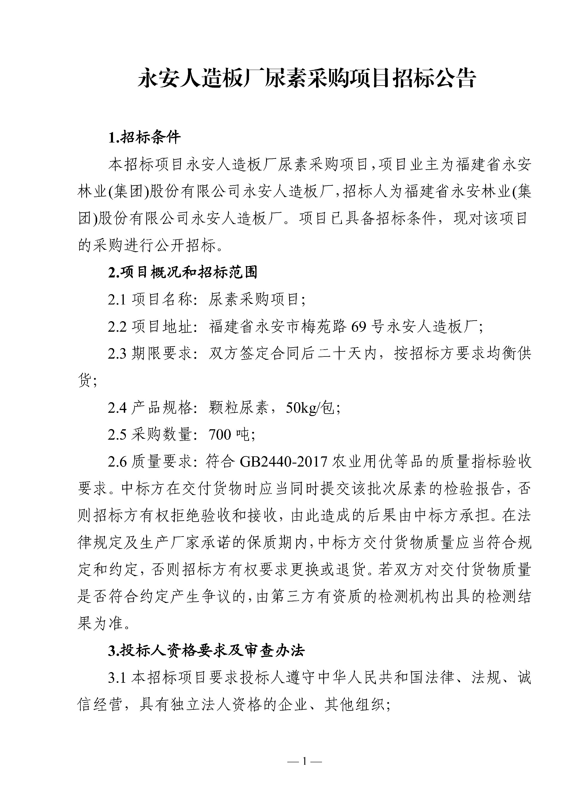 永安人造板廠尿素采購項(xiàng)目招標(biāo)公告