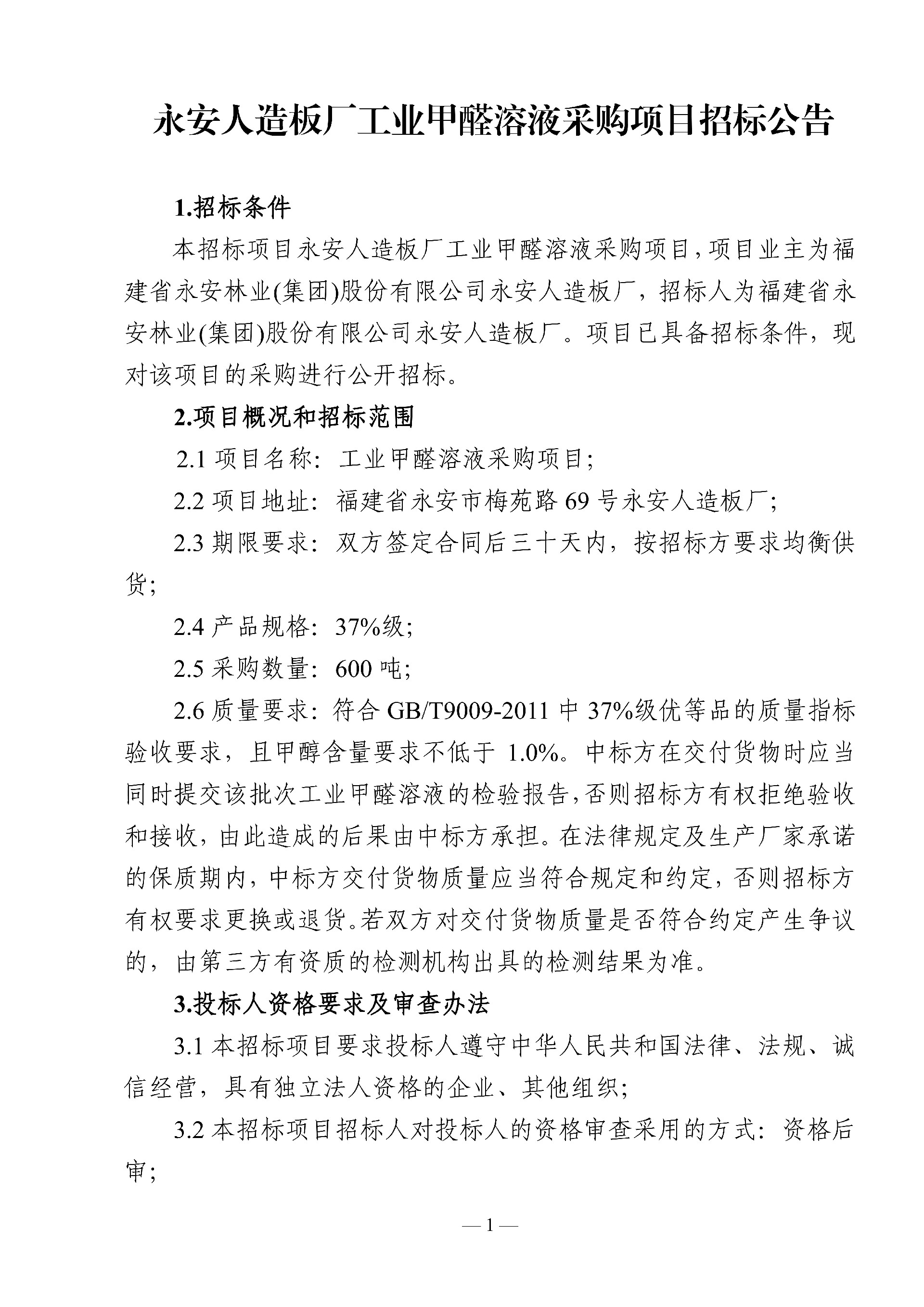 永安人造板廠工業甲醛溶液采購項目招標公告