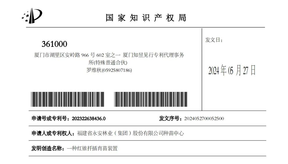 近日,永安林業所屬種苗中心《一種木莢紅豆育苗裝置》《一種紅錐扦插育苗裝置》2項實用新型專利獲得國家知識產權局授權。2項專利實用性強、應用領域廣,可有效提高育苗效率和苗木質量,為永安林業加強珍貴樹種培育進一步提供技術支撐。