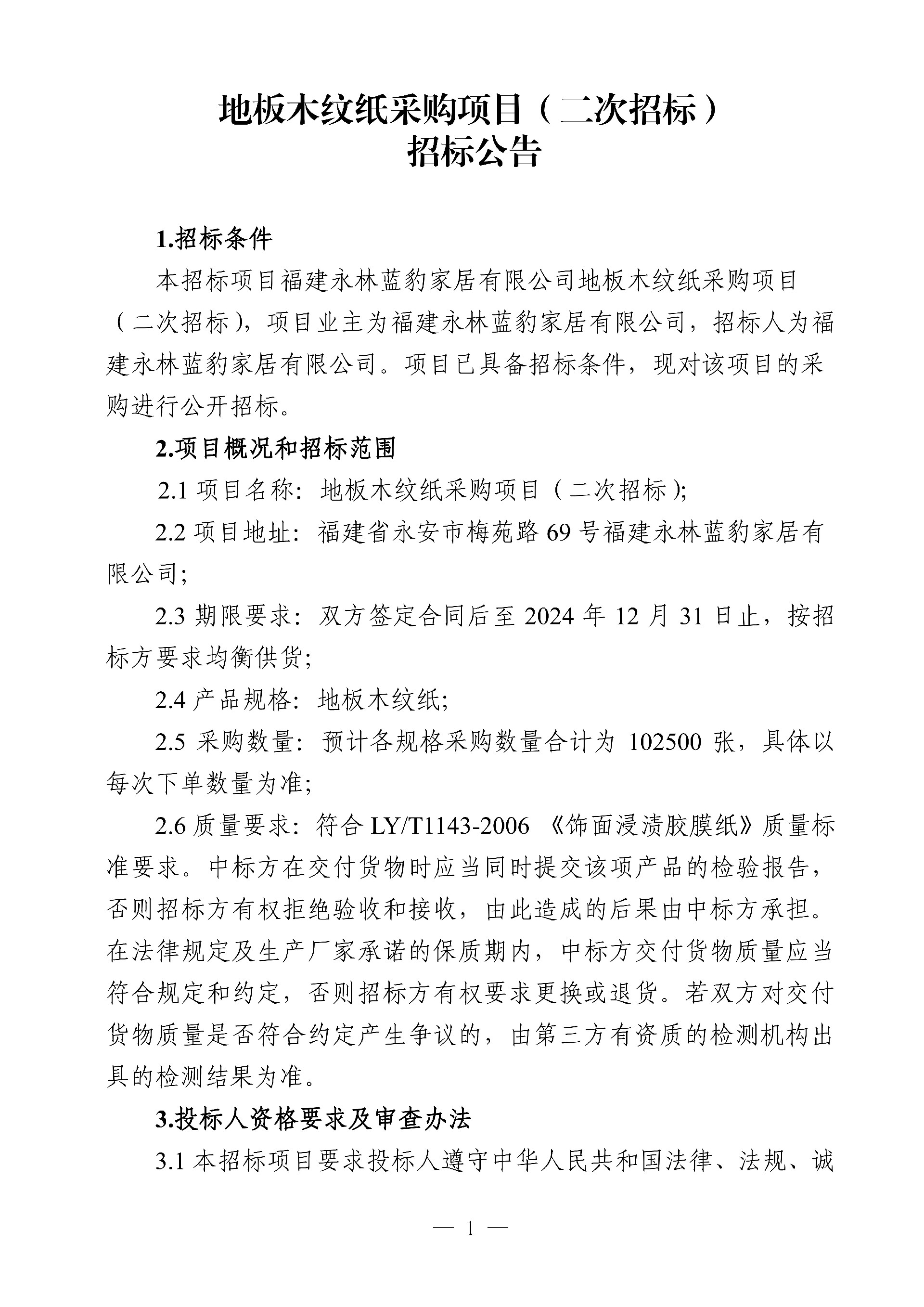 福建永林藍豹家居有限公司地板木紋紙采購項目(二次招標) 招標公告