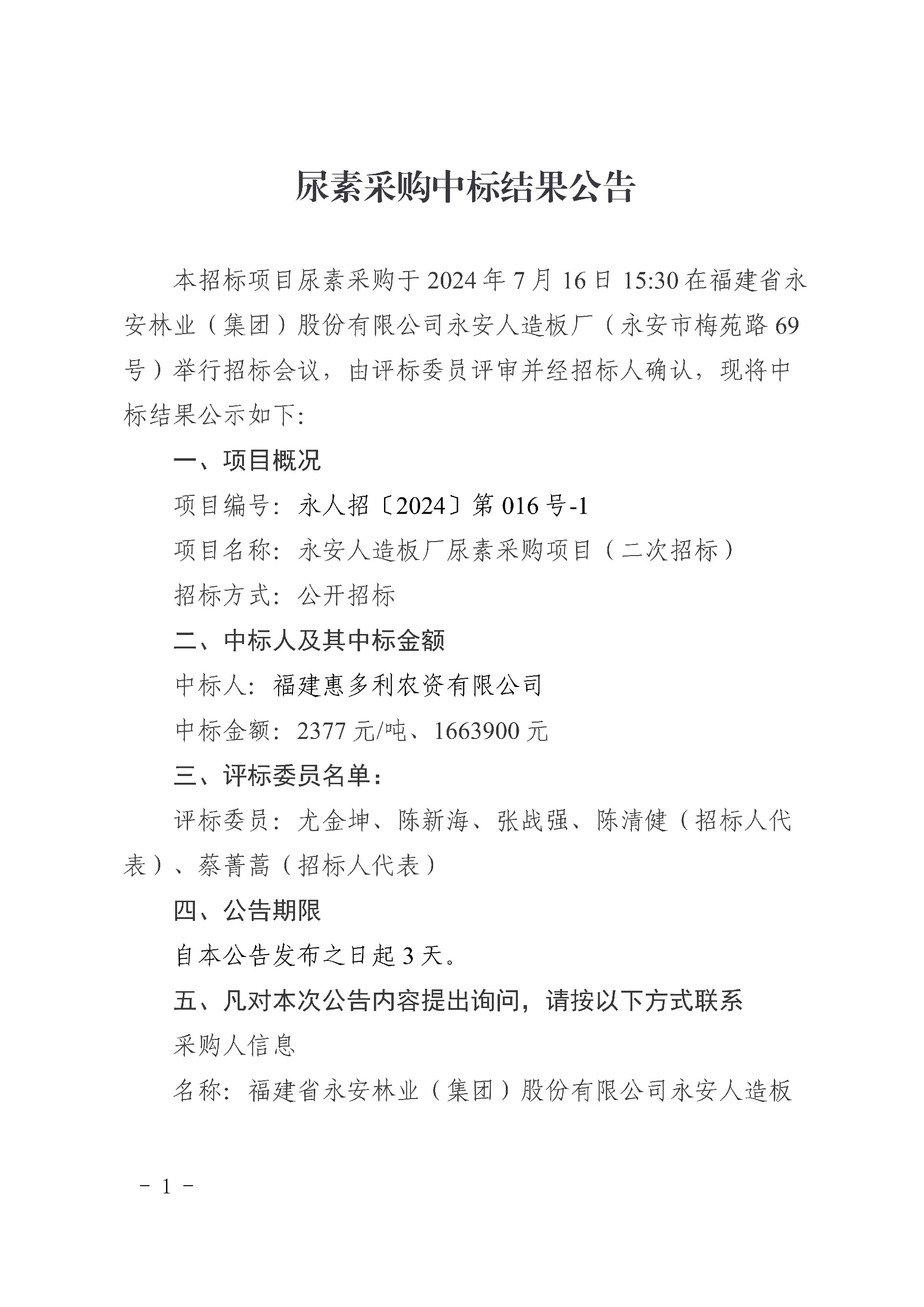永安人造板廠尿素采購(gòu)中標(biāo)結(jié)果公告