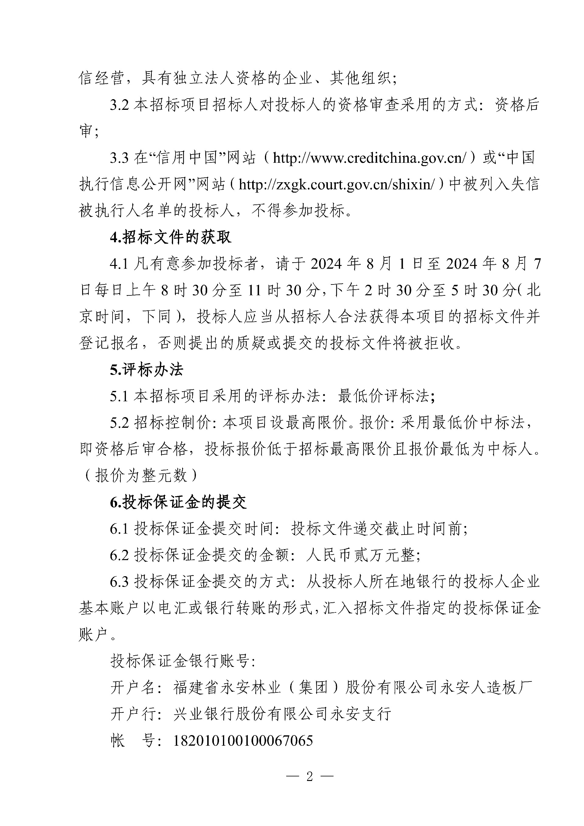 永安人造板廠工業甲醛溶液采購項目 招標公告