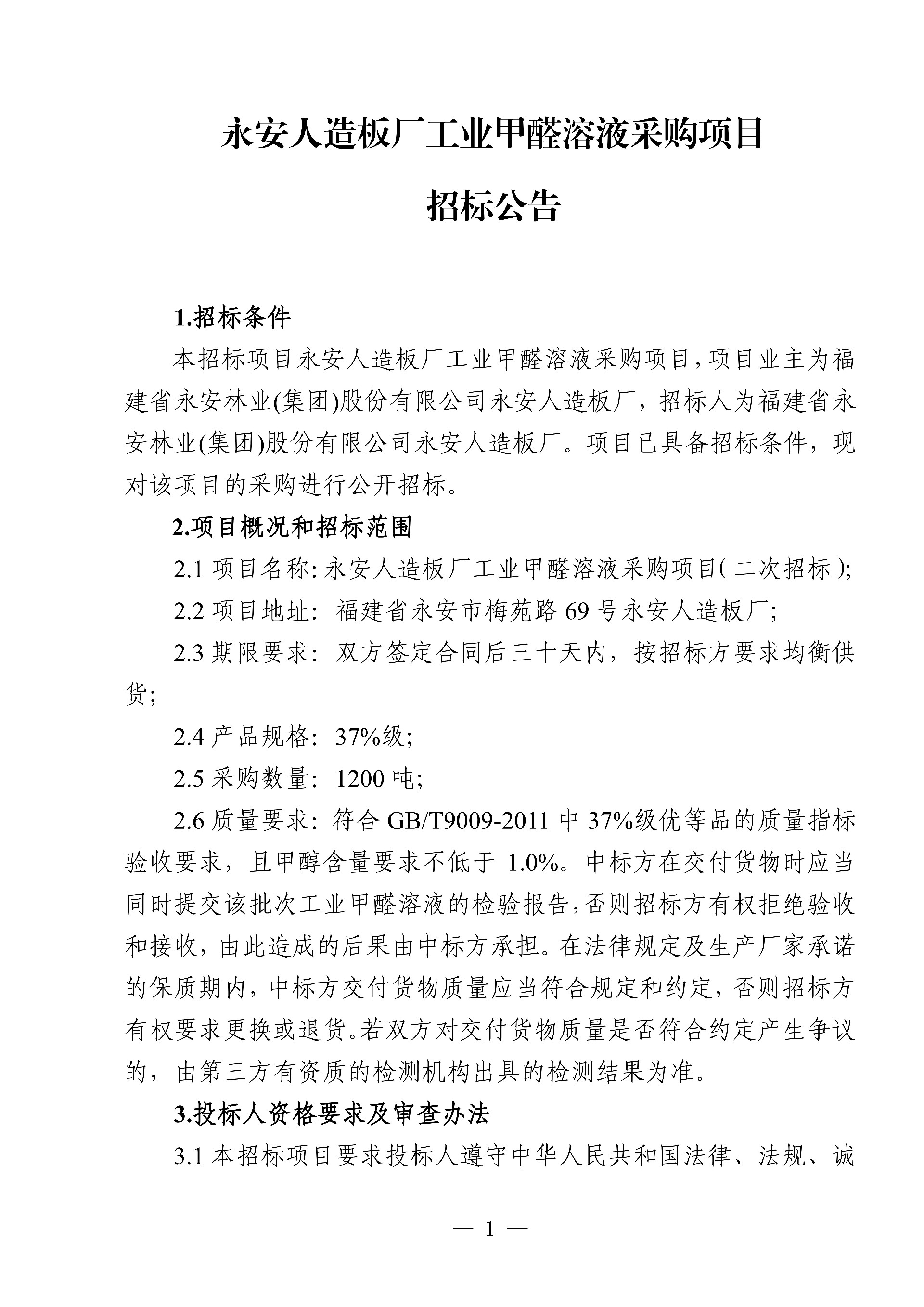 永安人造板廠工業甲醛溶液采購項目招標公告