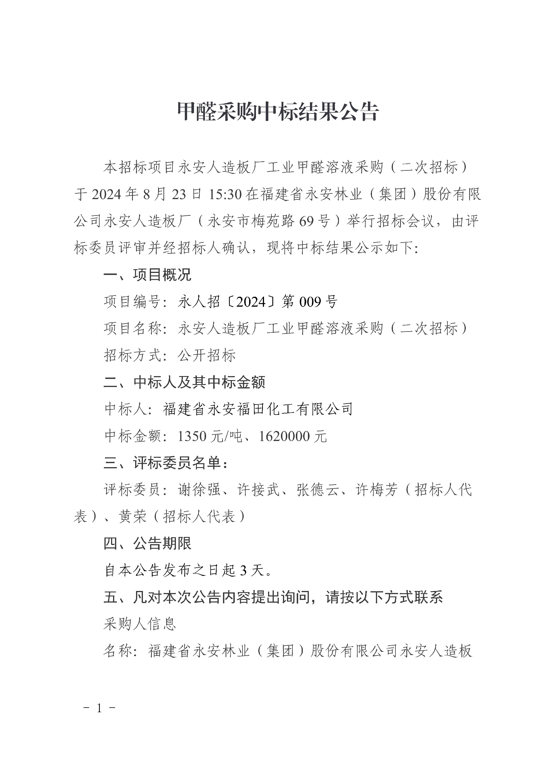永安人造板廠工業甲醛溶液采購項目招標公告