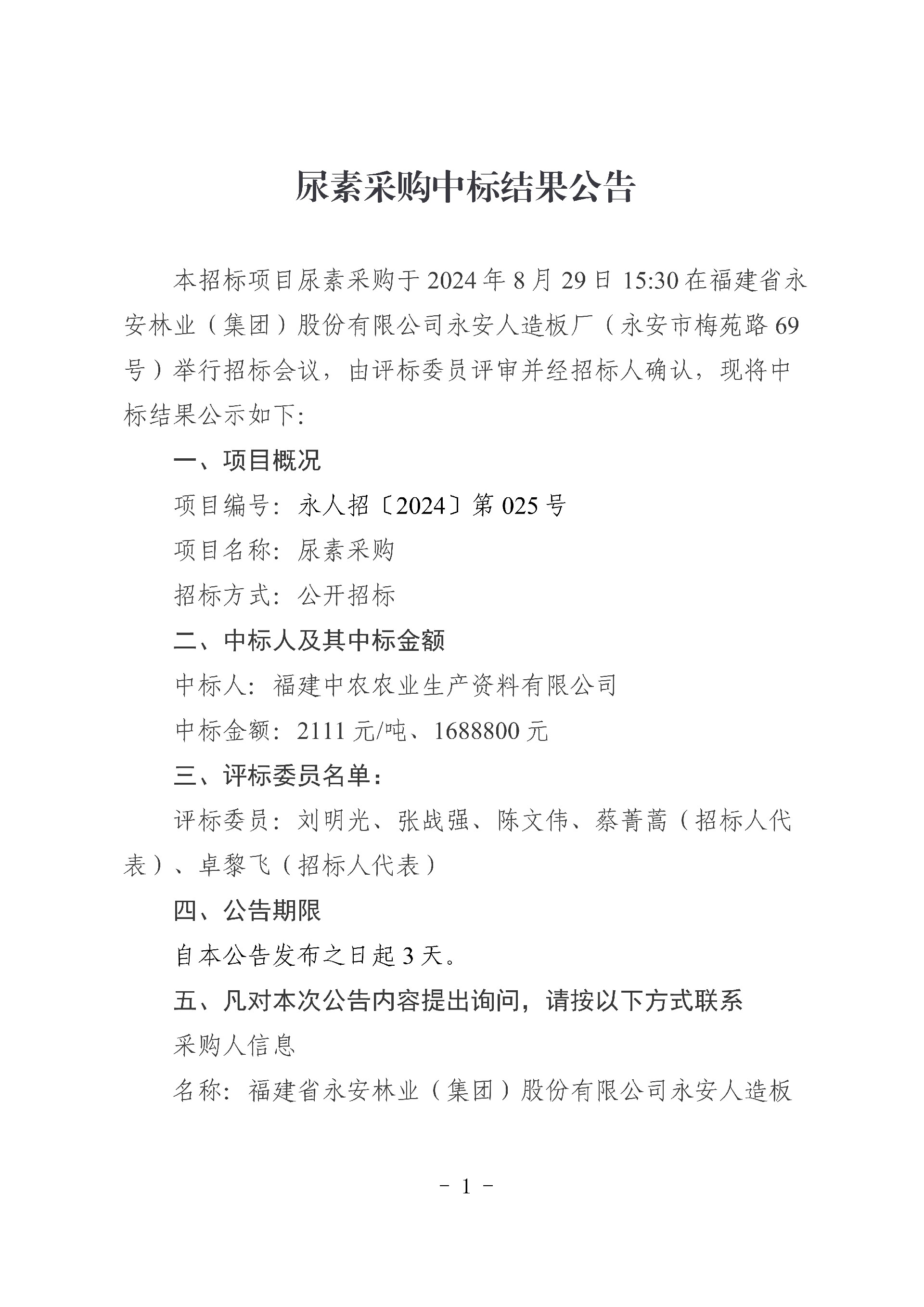 永安人造板廠尿素采購中標結果公告