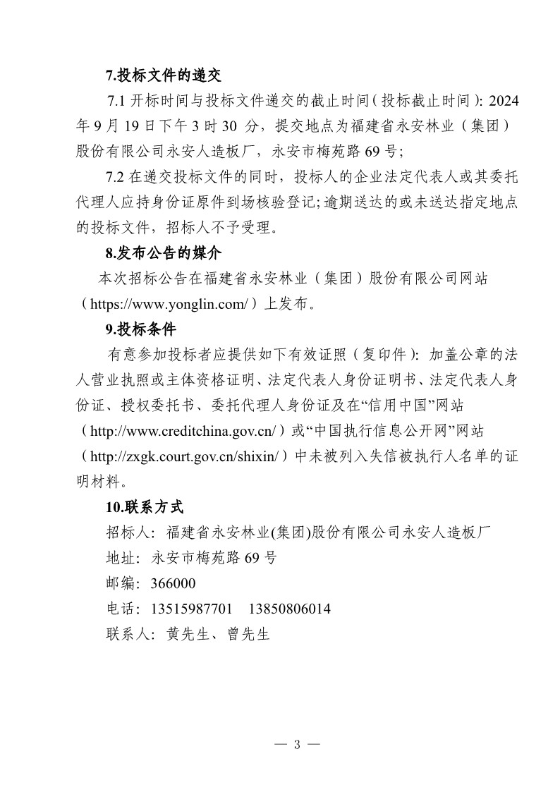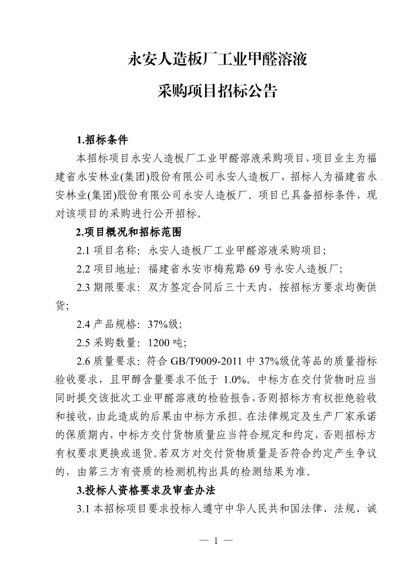 永安人造板廠工業(yè)甲醛溶液采購項目招標公告