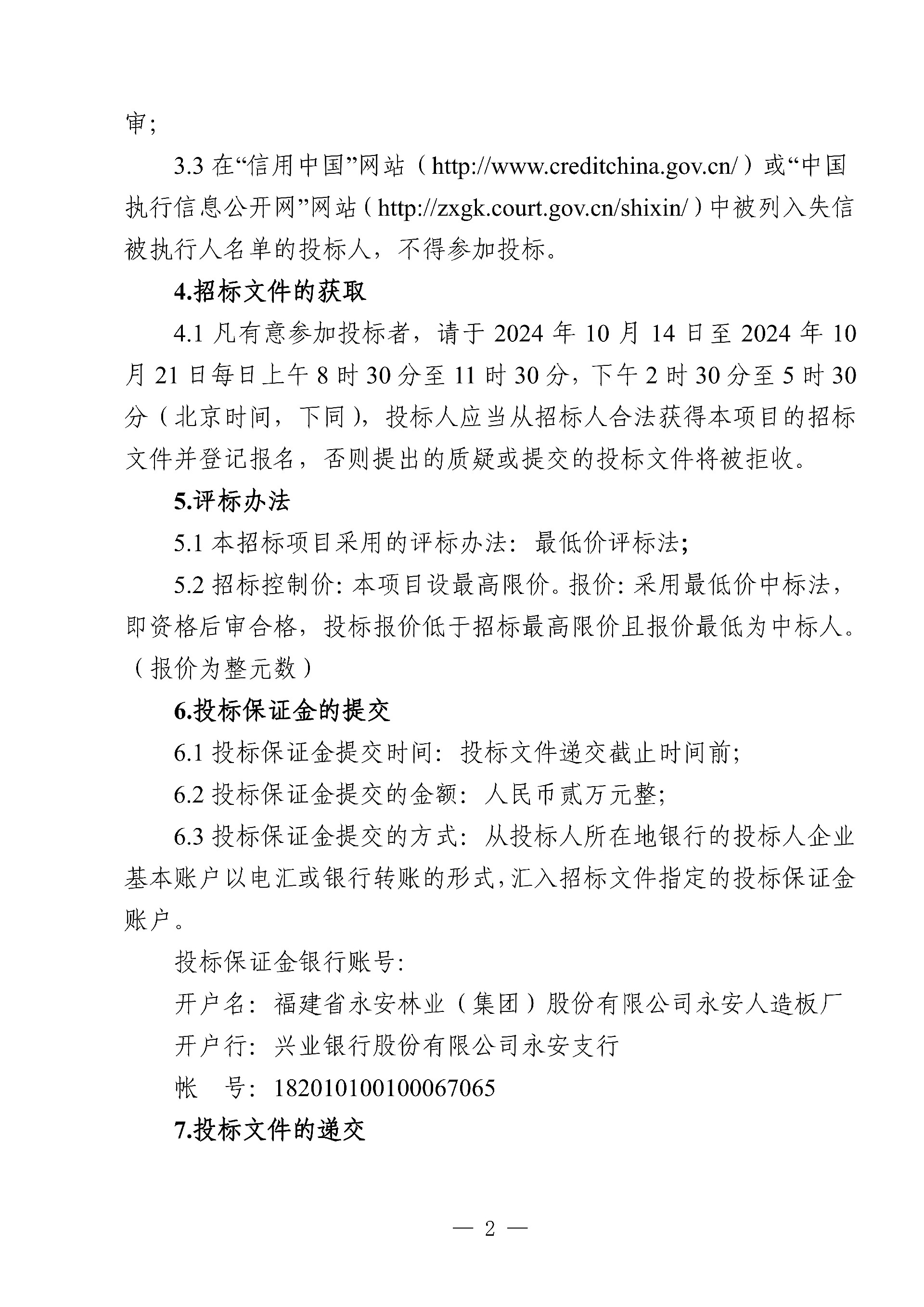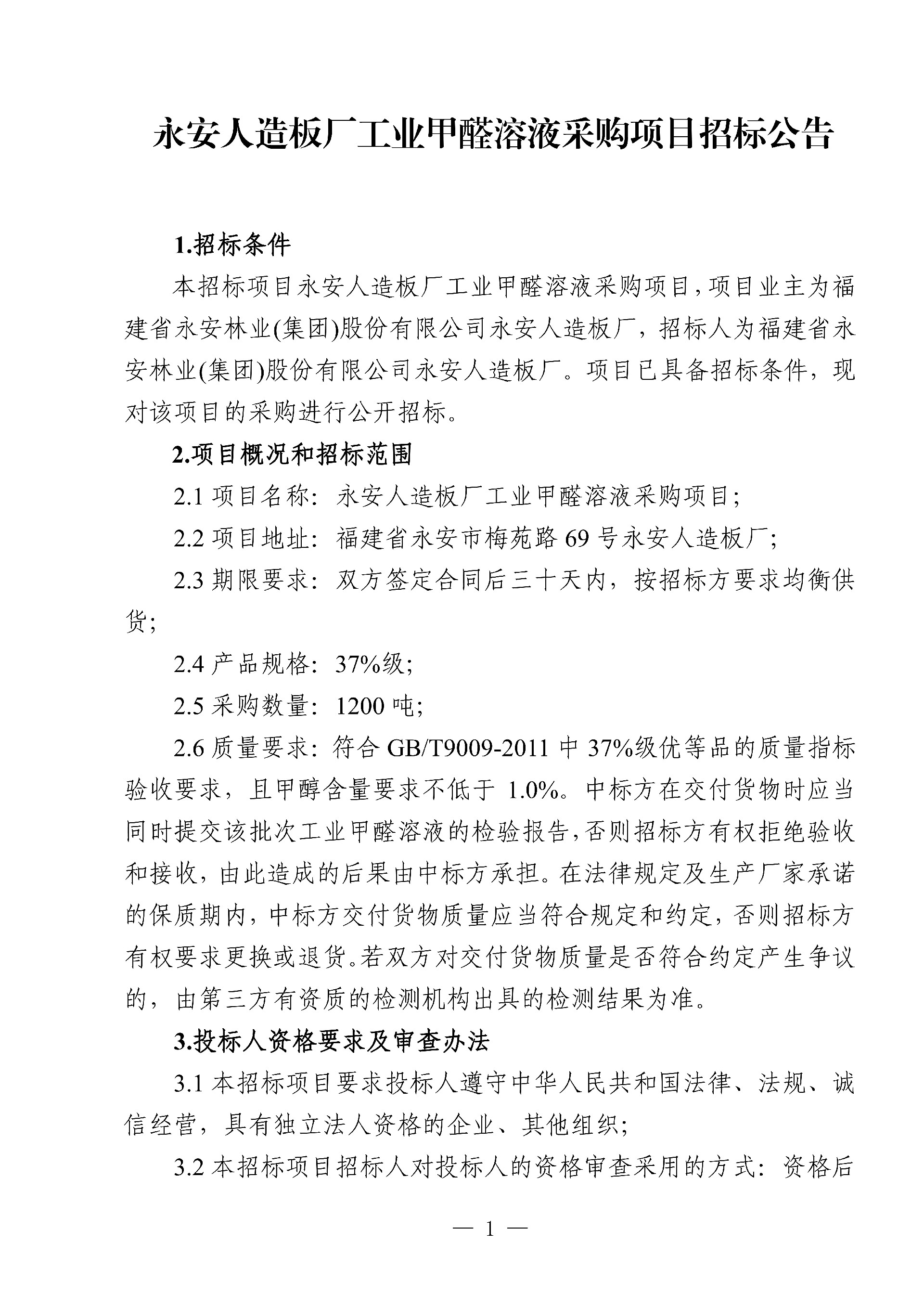 永安人造板廠工業甲醛溶液采購項目招標公告