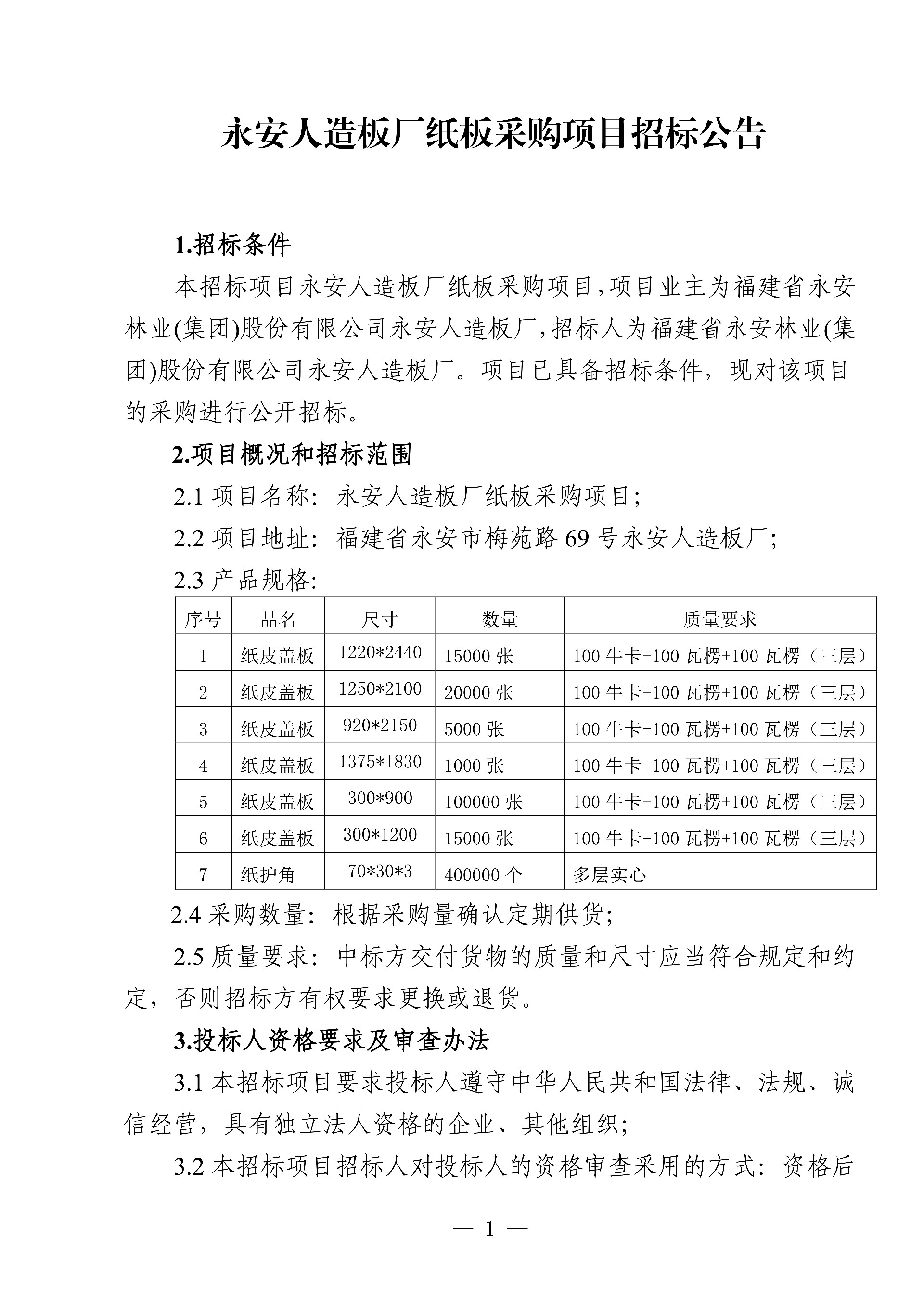 永安人造板廠紙板采購(gòu)項(xiàng)目招標(biāo)公告