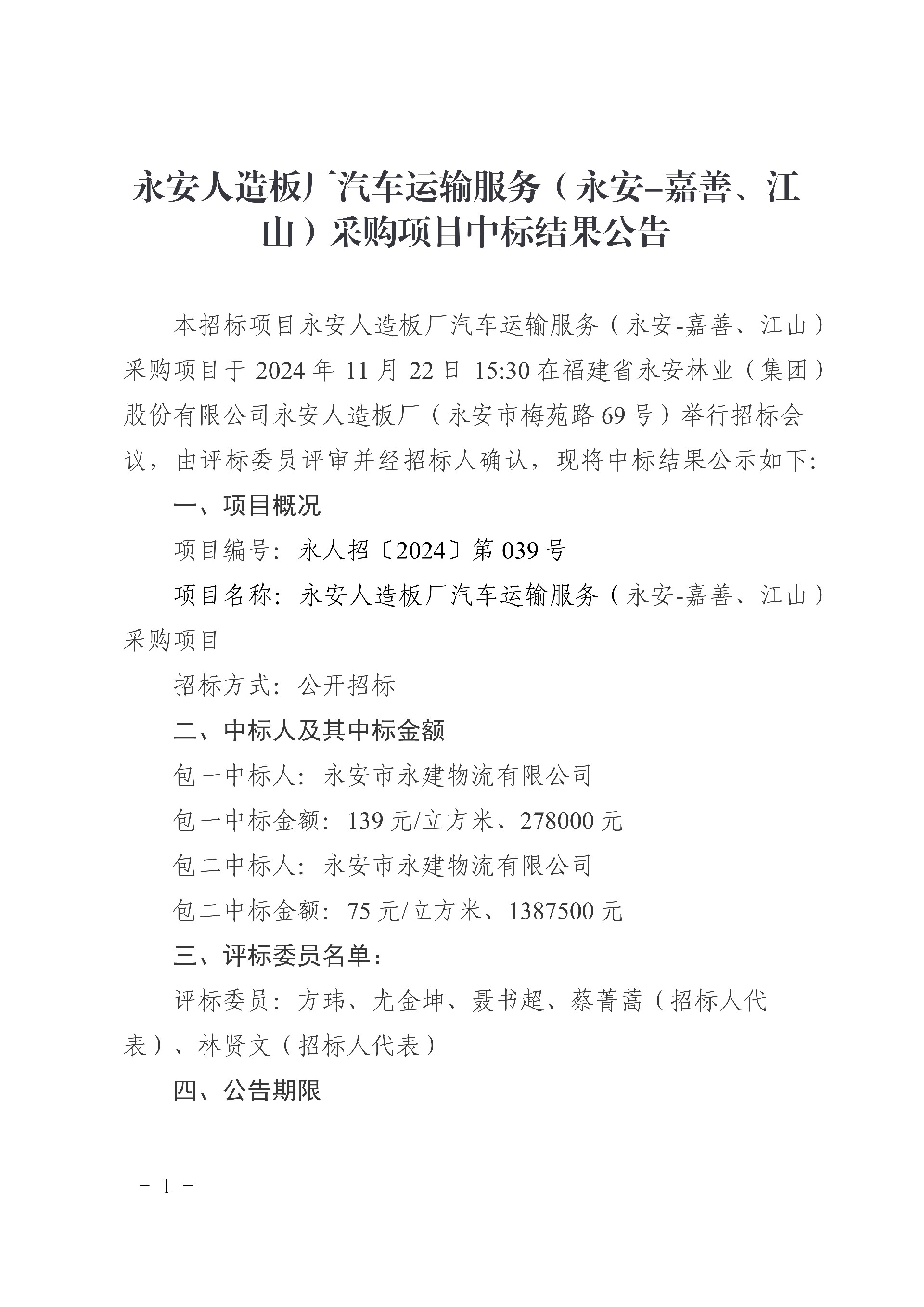 永安人造板廠汽車運輸服務(永安-嘉善、江山)采購項目中標結果公告