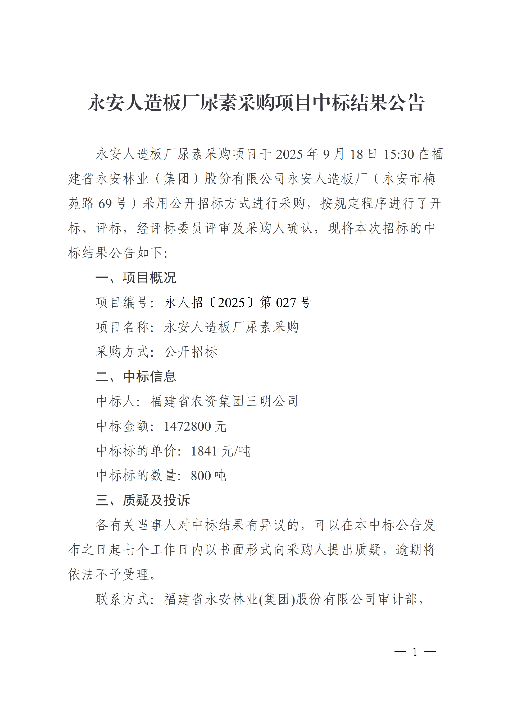 永安人造板廠尿素采購項目中標結果公告