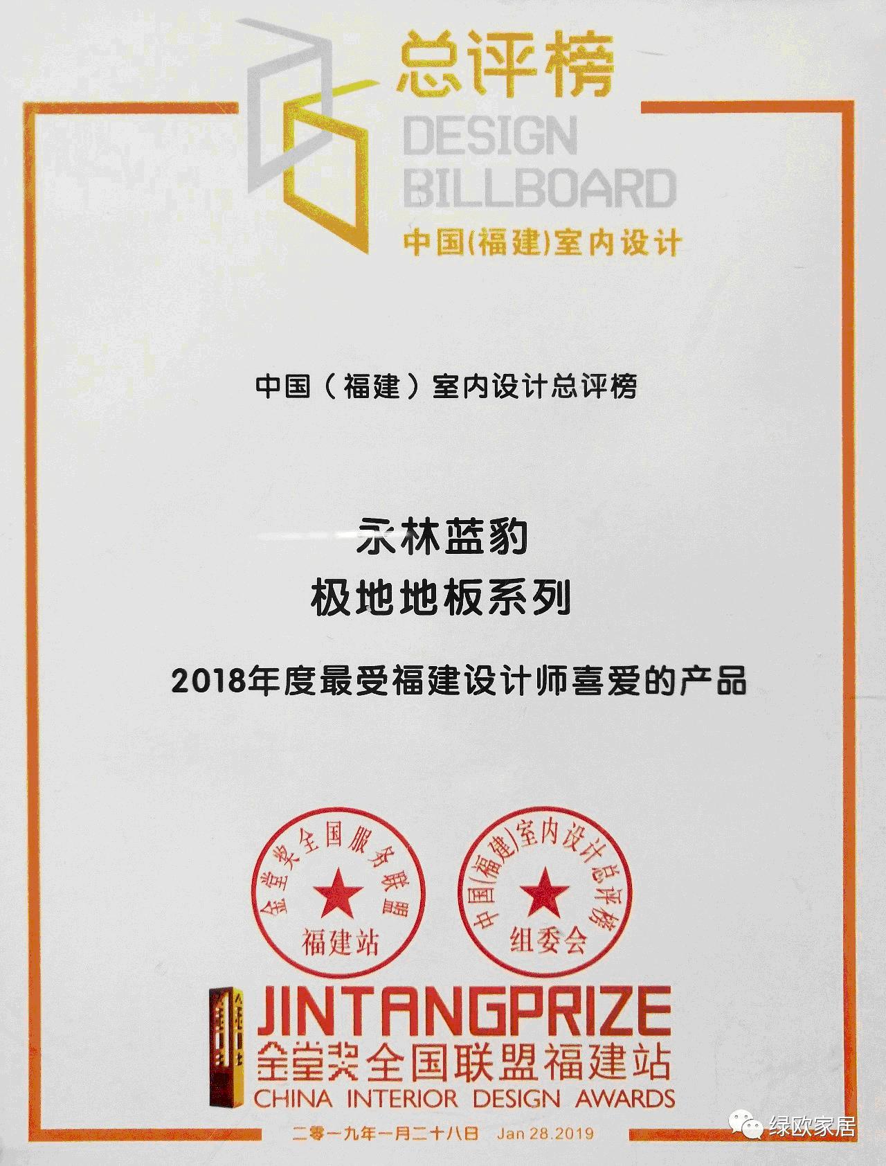 永林藍豹極地地板憑借 無醛、耐水、耐磨專利技術創新精神,尤其是在耐水滲透強、地熱、隔音、耐磨、彈性等方面有其它合材料無法比擬的優點,同時秉承永林藍豹獨有的多項防潮專利技術為基礎,防潮性能強,吸水厚度膨脹率遠低于國家標準,特別適合南方潮濕氣候和北方地熱家居需求等優點,被評選為“金堂獎2018中國(福建)室內設計總評榜?年度最受福建設計師喜愛的產品”榮譽。
