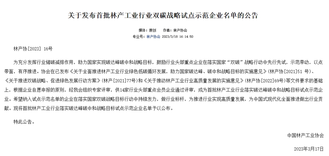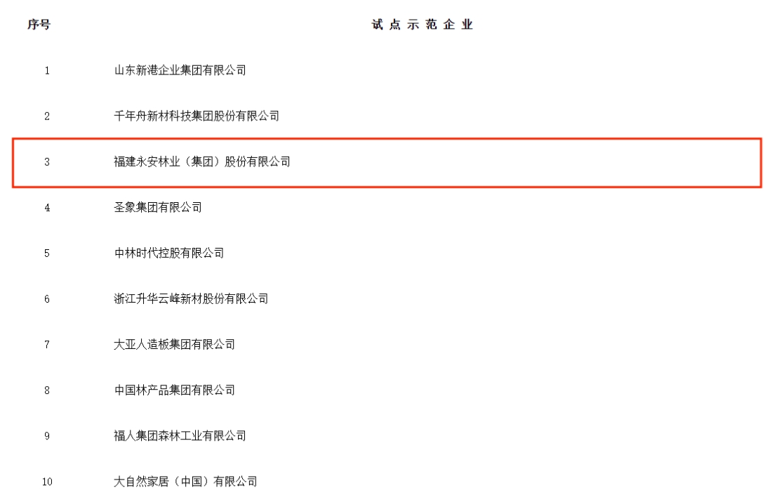近日,中國林產工業協會公布了首批林產工業行業雙碳戰略試點示范企業名單,福建省永安林業(集團)股份有限公司成功入選,成為首批林產工業行業落實碳達峰碳中和戰略目標試點示范企業之一。