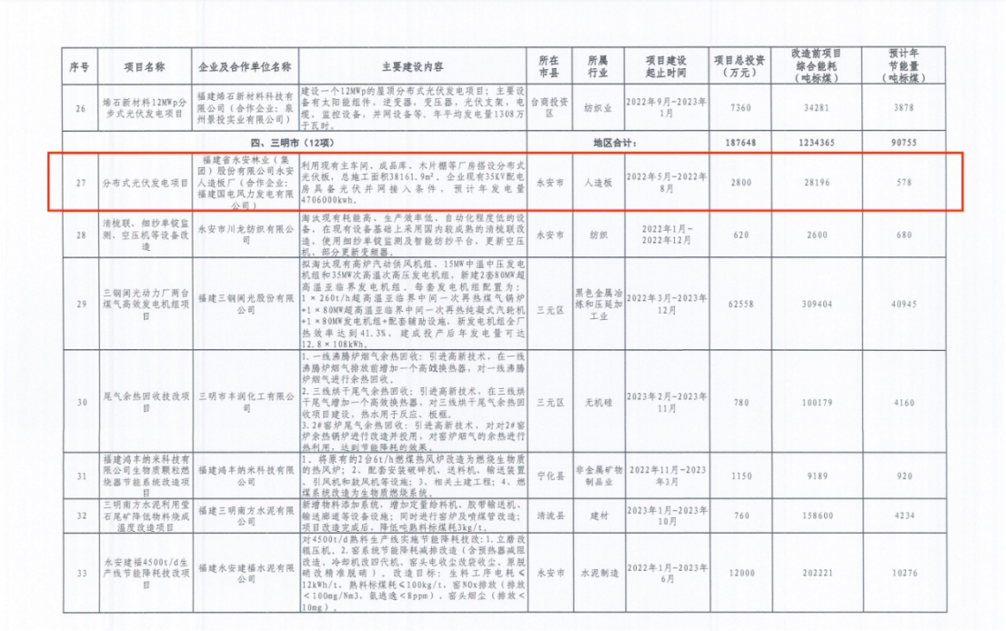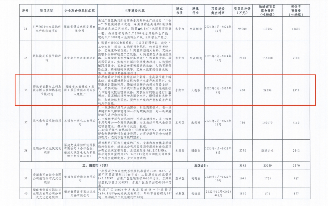 近日,福建省工業和信息化廳公布了2023年省工業重點節能改造項目名單,福建省永安林業(集團)股份有限公司下屬永安人造板廠的分布式光伏發電項目、高效節能薪材上料系統與板坯預加熱系統節能改造項目成功入選。