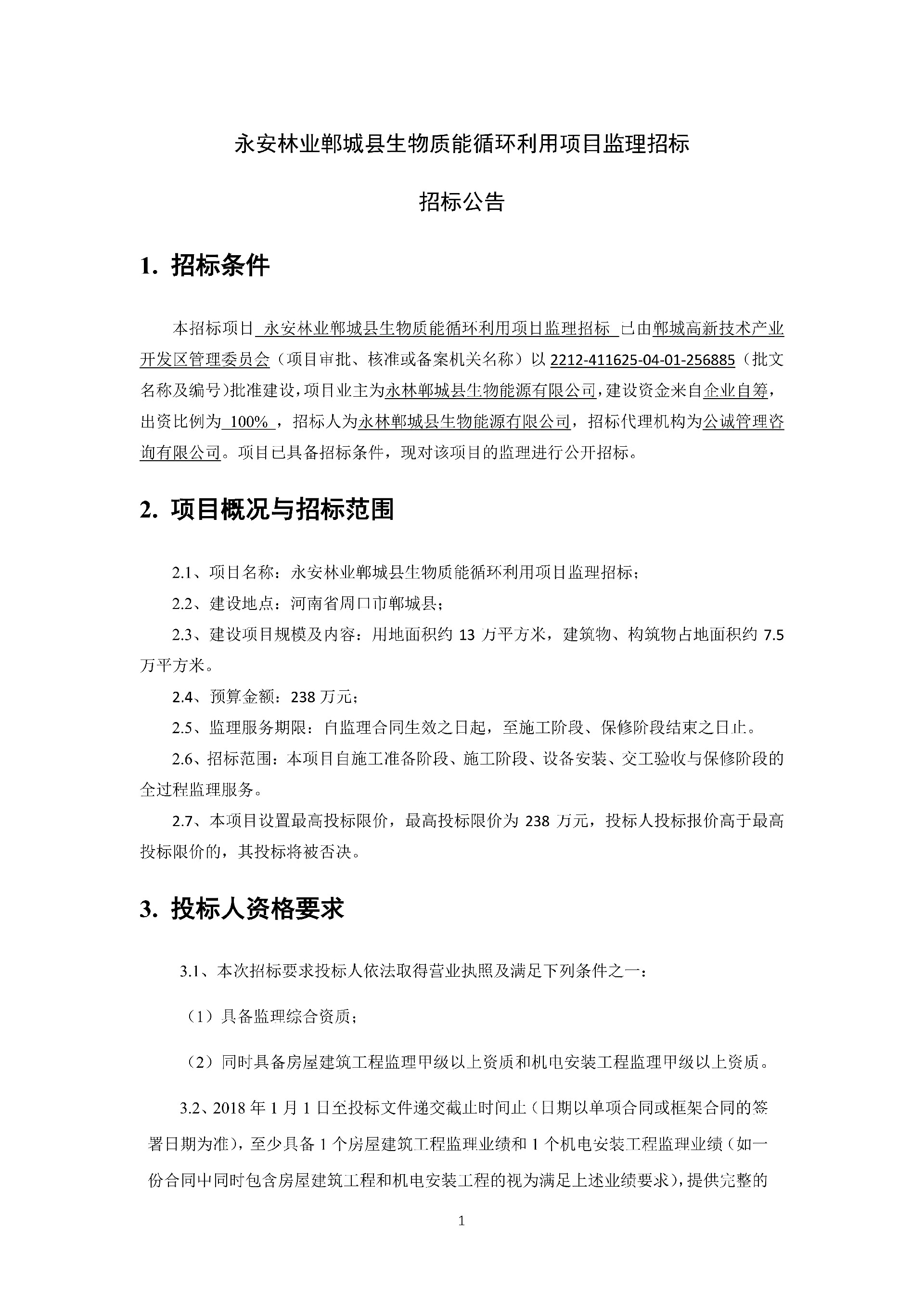 永安林業(yè)鄲城縣生物質(zhì)能循環(huán)利用項目監(jiān)理招標公告