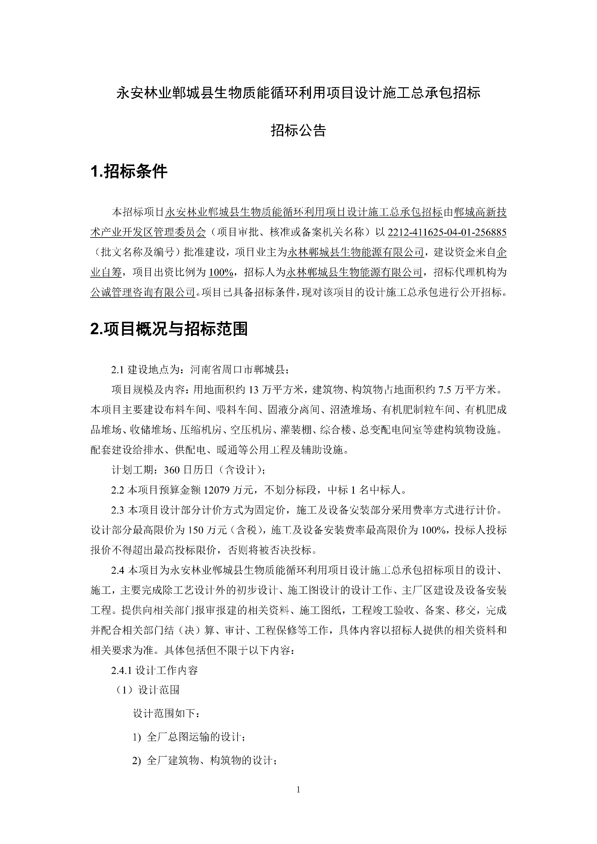 永安林業(yè)鄲城縣生物質(zhì)能循環(huán)利用項目設(shè)計施工總承包招標(biāo)公告