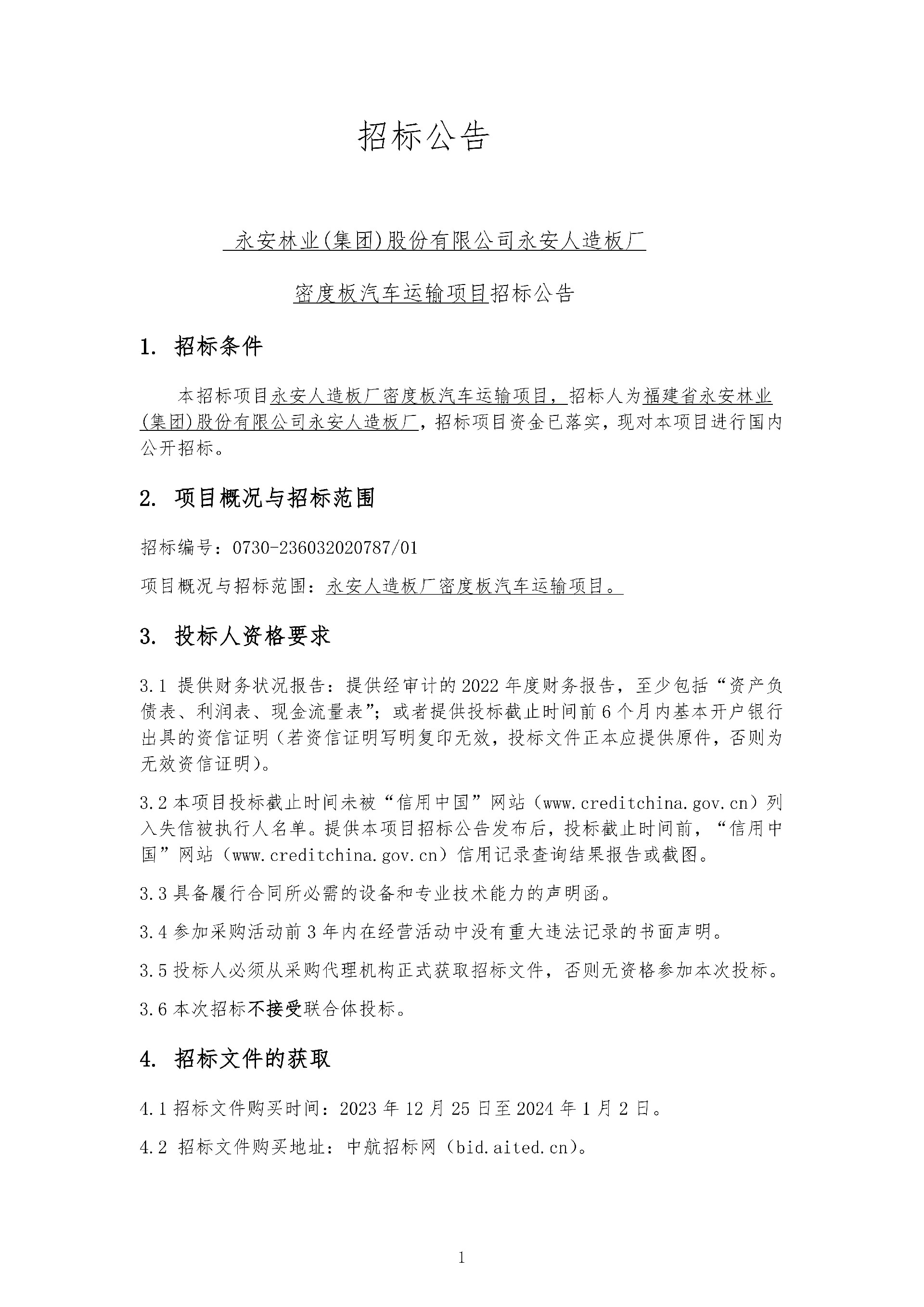 2024年度永安人造板廠密度板汽車運(yùn)輸項(xiàng)目招標(biāo)公告