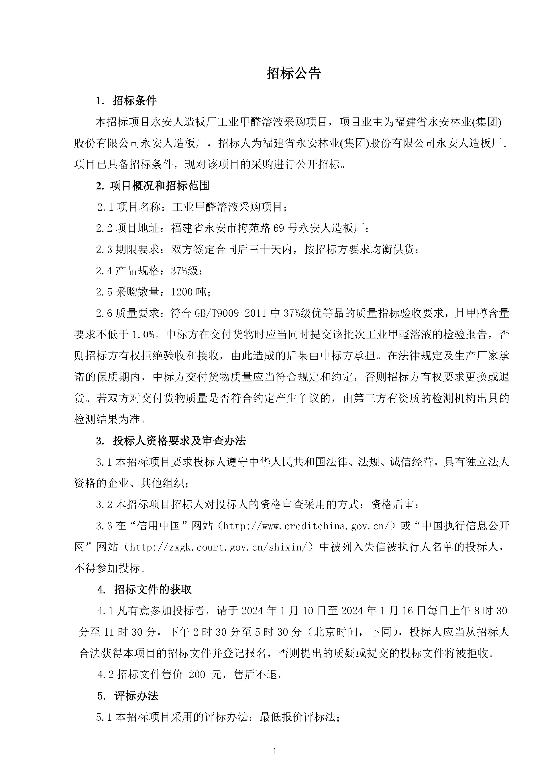 永安人造板廠工業甲醛溶液采購項目招標公告